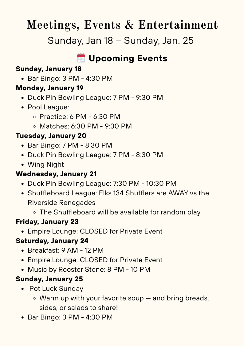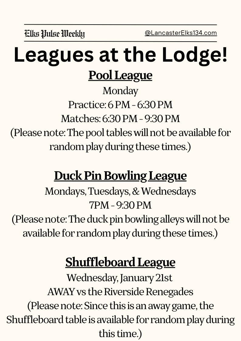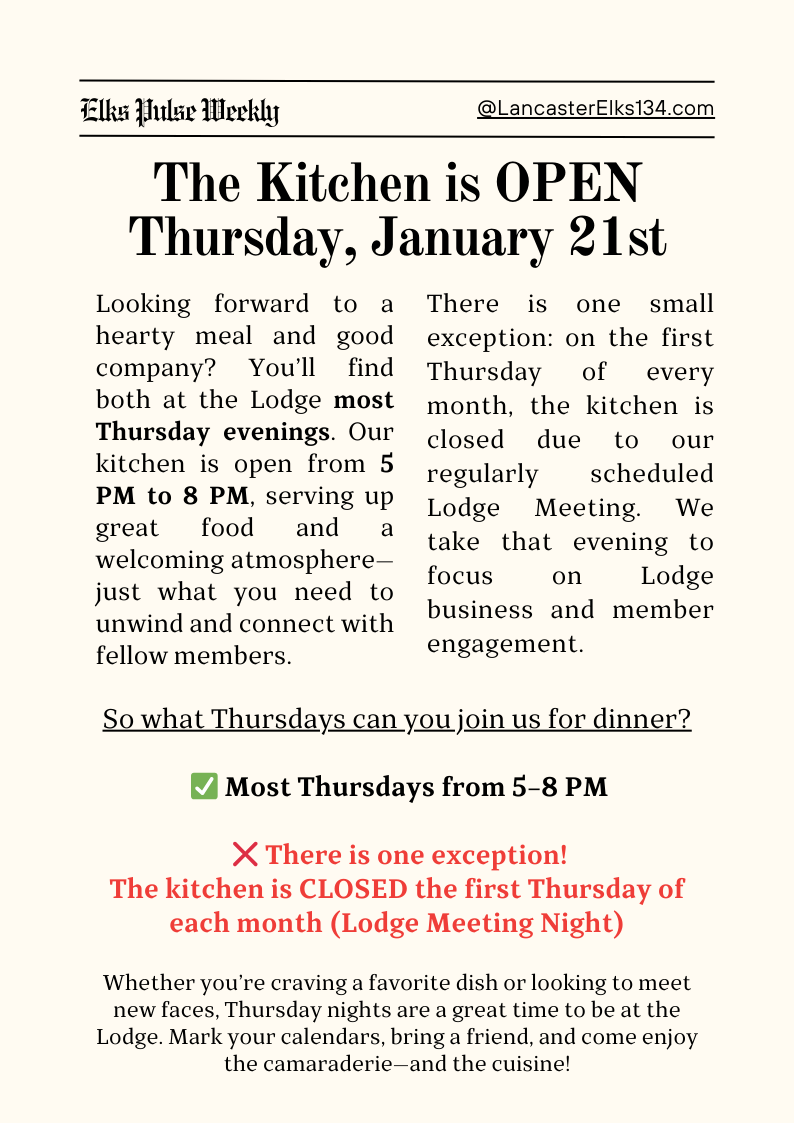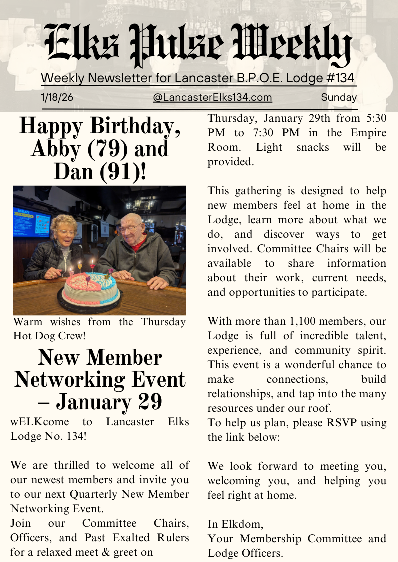 Elks Pulse Weekly Elks Pulse Weekly 1/18/26 Raymond A Wilkinson, PER 18 Jan 2026 • 1 min read Member Networking Event - Please RSVP to this link: https://www.signupgenius.com/go/10C094AA5A92EA3FDC16-61591689-lancaster