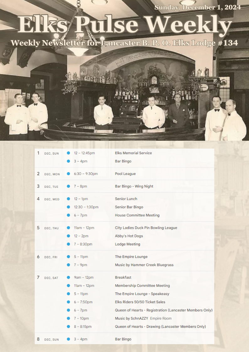 Elks Pulse Weekly Elks Pulse Weekly - 12/1/24 Raymond A Wilkinson, PER 01 Dec 2024 • 1 min read Share ORIGIN OF "HELLO, BILL!" Visit Elks.org for the origin of "Hello Bill!"