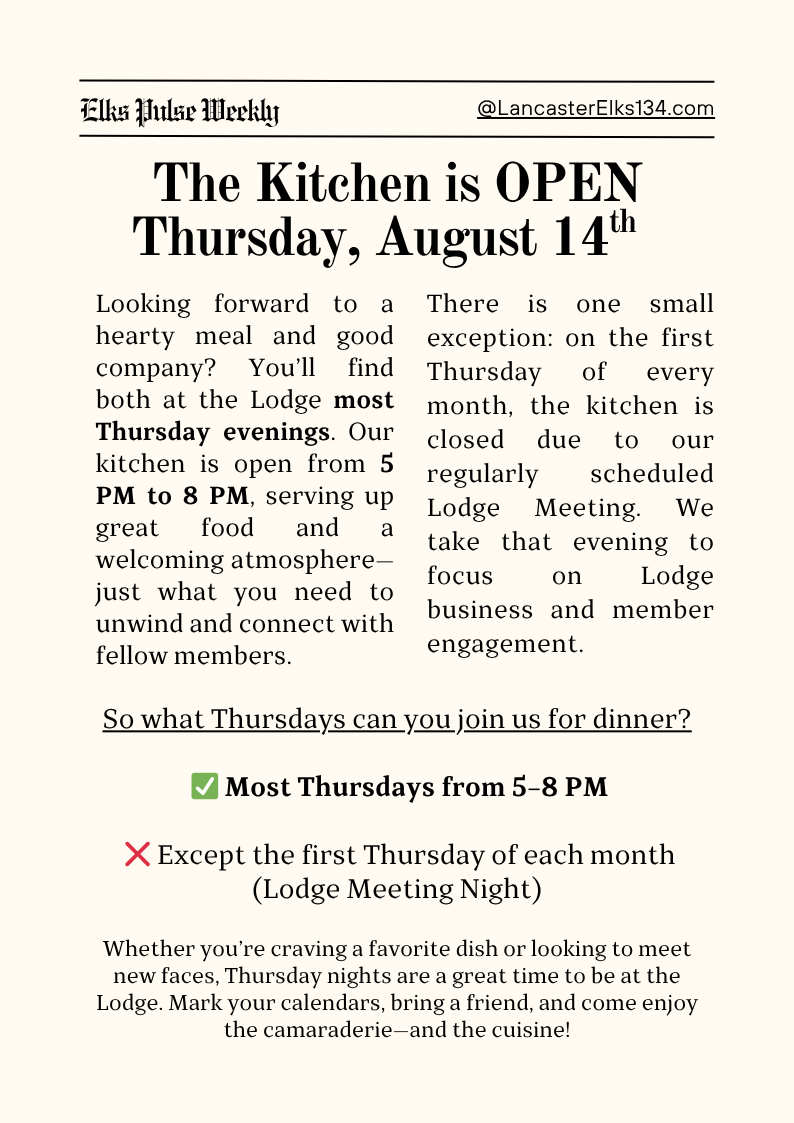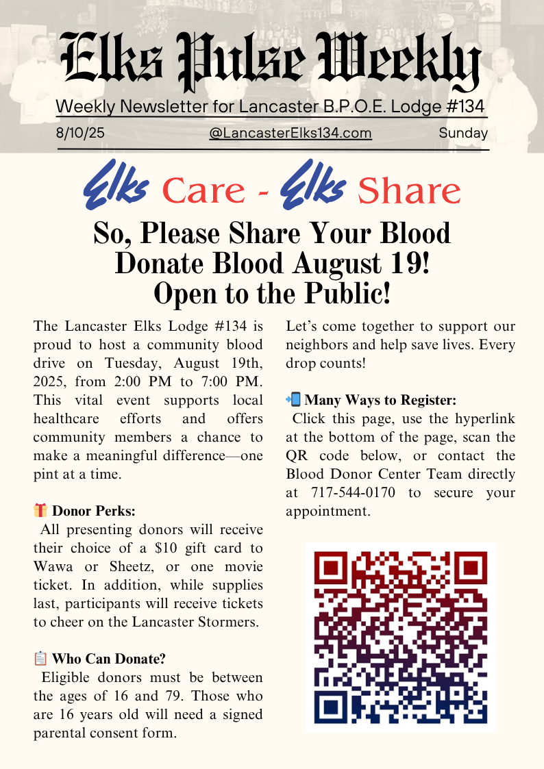 Elks Pulse Weekly Elks Pulse Weekly 8/10/25 Raymond A Wilkinson, PER 10 Aug 2025 • 1 min read Share Blood Drive