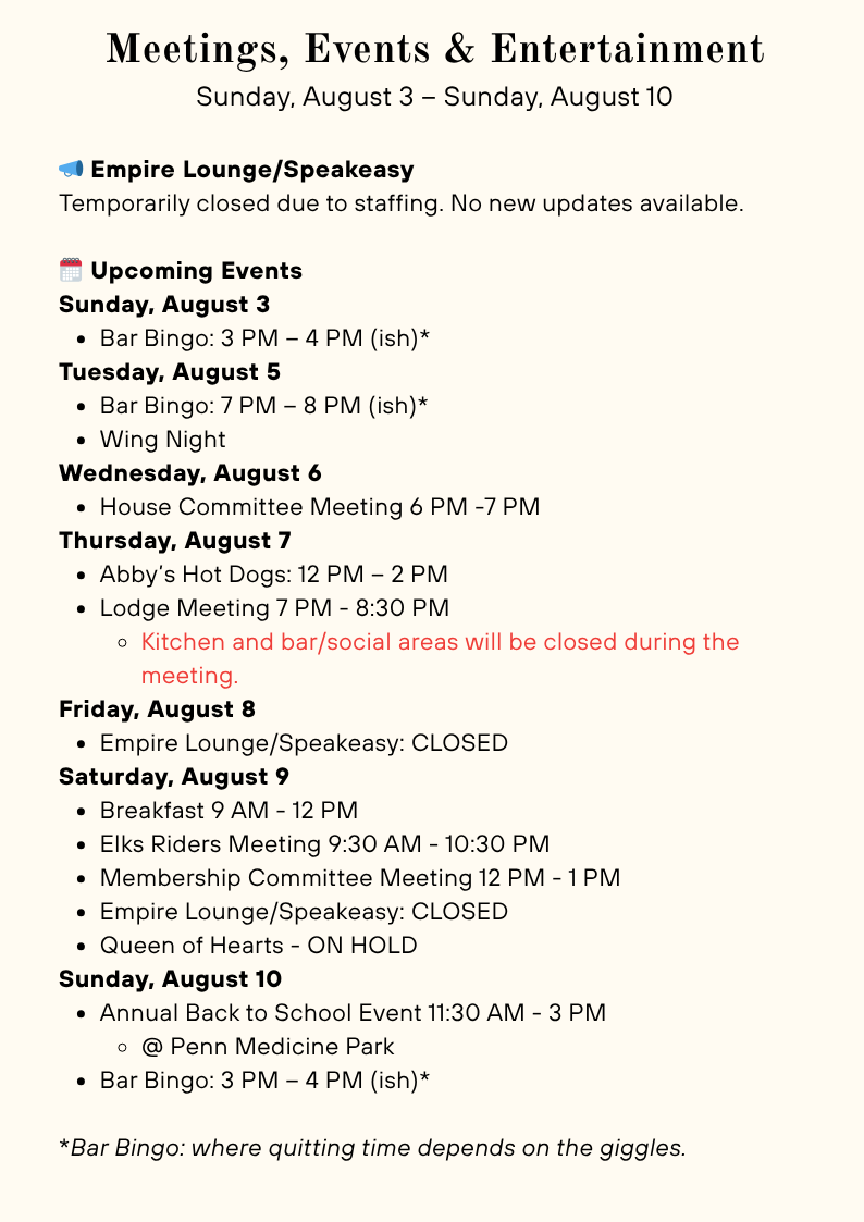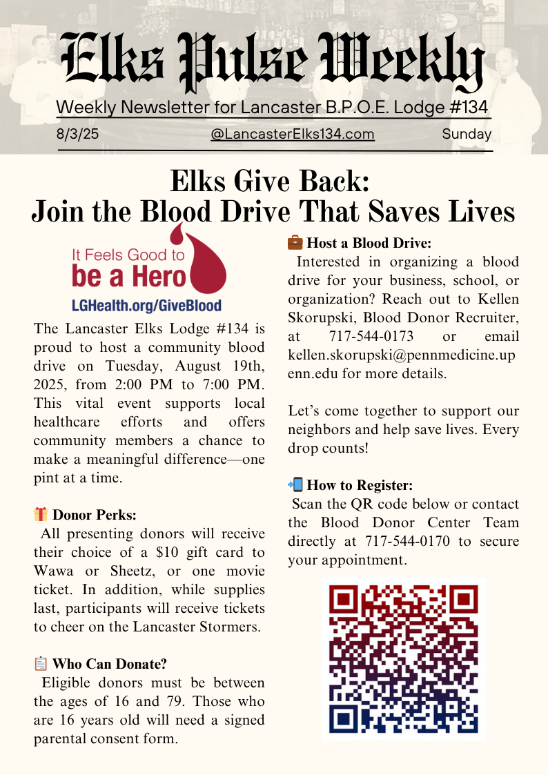 Elks Pulse Weekly Elks Pulse Weekly 8/3/25 Raymond A Wilkinson, PER 03 Aug 2025 • 1 min read Share Blood Drive