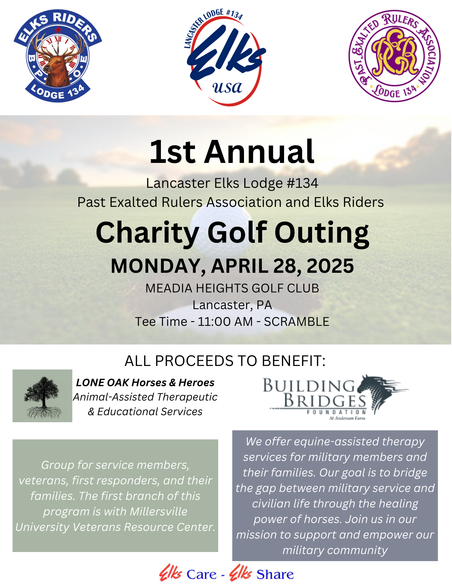 News Elks Riders & PER Association 1st Annual Charity Golf Outing Raymond A Wilkinson, PER 14 Feb 2025 Registration Opens Sunday, February 16th! For questions, please contact us @ elks134golf@gmail.comRegister Here Starting Sunday, February 16th
